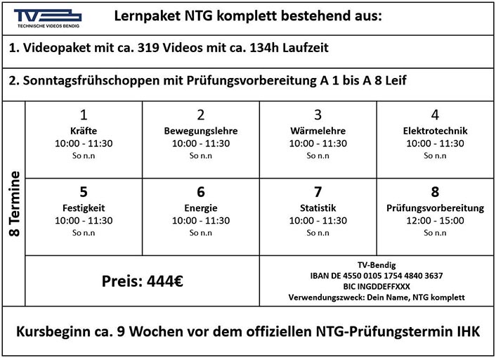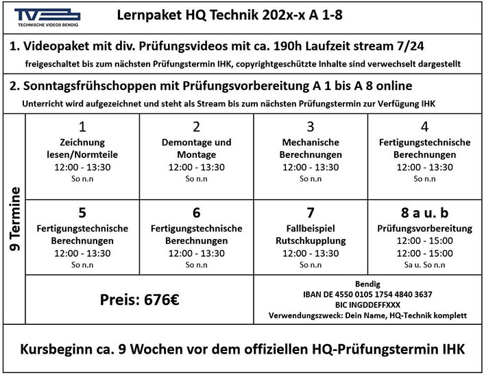 in diesem Videopaket haben wir unsere wichtigsten Sonntagsfrühschoppen sowie unsere wichtigsten Prüfungsvorbereitungstermine für HQ Technik IM Metall zusammengefasst und als Stream mit ca. 190h Stunden vorbereitet. Das Videopaket ist ideal geeignet um sich auf die Prüfung vollumfänglich im Bereich Technik vorzubereiten. Copyright geschützten Inhalte sind verpixelt dargestellt. Originalprüfungen erforderlich.